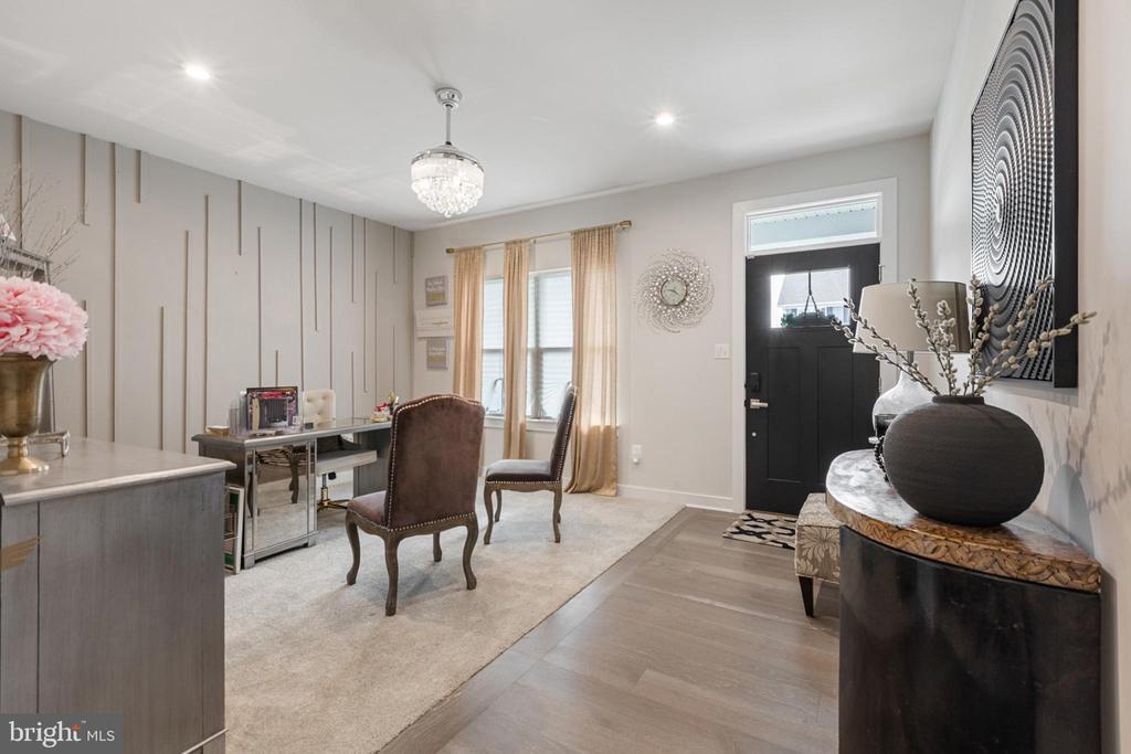 The gourmet kitchen is a true showstopper, featuring stainless steel appliances, an oversized island with stunning pendant lighting, and plenty of space for cooking and entertaining. Just off the main living areas, you will find thoughtful upgrades like a custom accent wall in the office and a dramatic accent wall in the two-story stairwell, perfectly framed by the home’s soaring ceilings adding character and architectural interest to the space.
